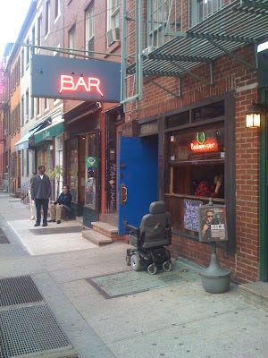 1) Where is the person in the wheelchair, and assuming they are inside how did they get inside the bar?