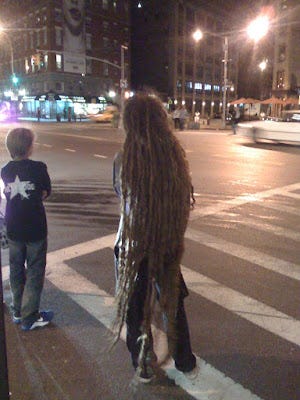 Wow. Walking down the street the other night I spotted this guy with the longest hair (and dreadlocks) I have ever seen. I remember always seeing the pictures in The Guniness Book of World Records for the world's longest hair, but this seems to top any pictures I've ever seen. I couldn't resist snapping a quick photo on my iPhone...